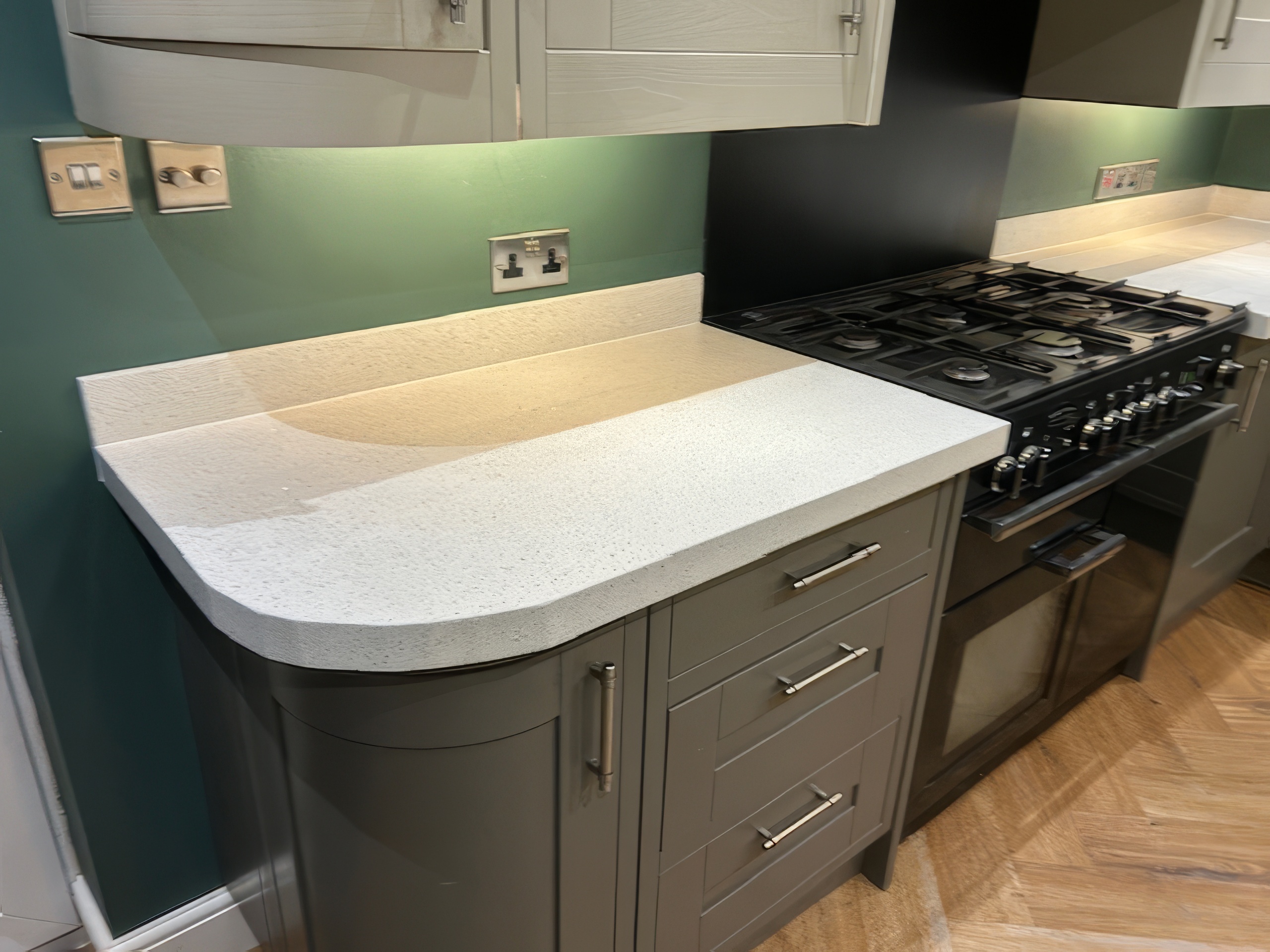 White Sparkle overlays set a cleaner, brighter tone across the kitchen. Edges are precise, joins discreet, and upkeep stays simple day to day. Quicktops templated and fitted neatly, keeping mess to a minimum.