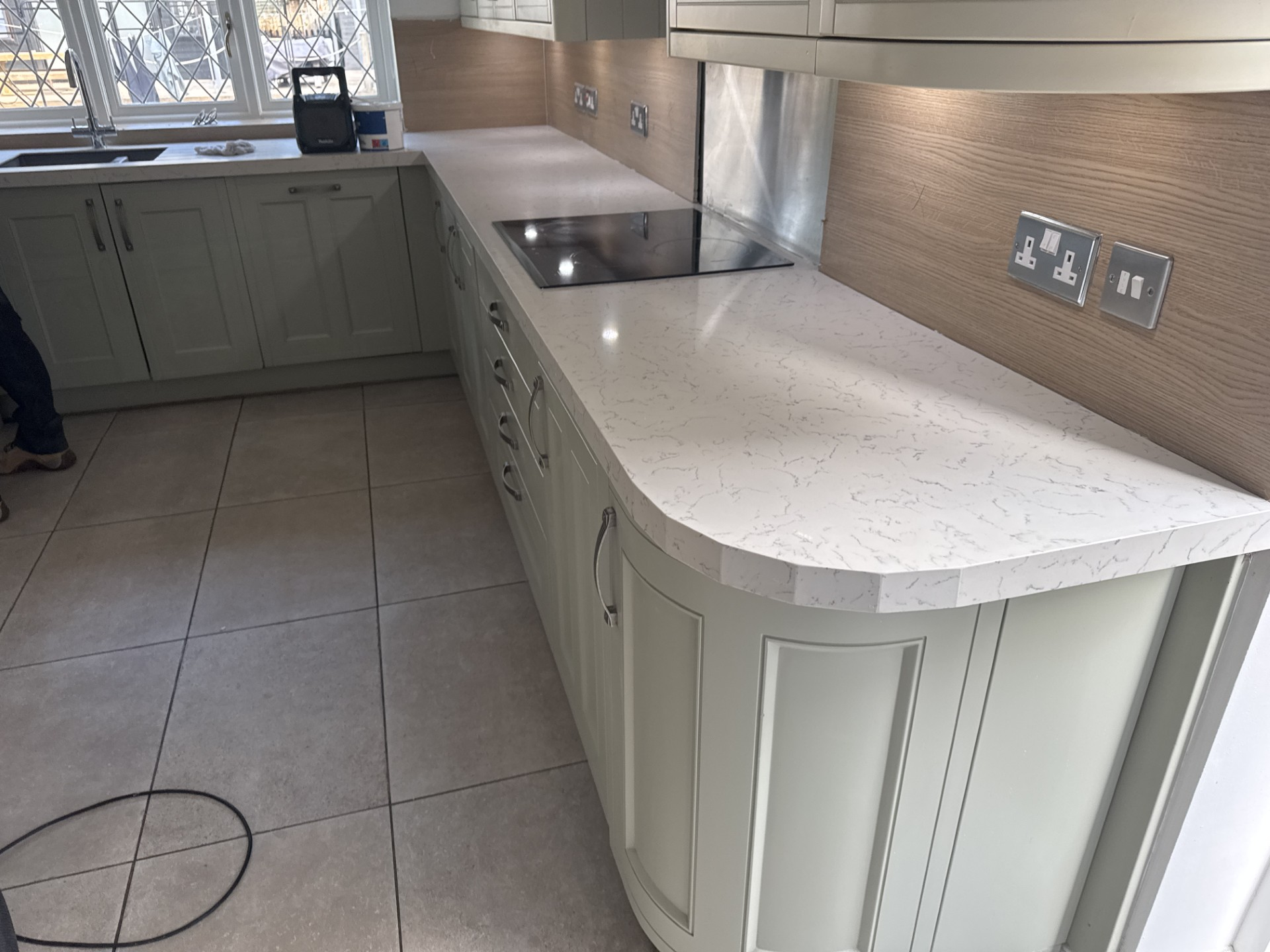 Siobhan’s kitchen in Essex gains a calm, luxurious lift with a Carrara Marble quartz overlay worktop—delivering a fresh look without the cost or disruption of a full refit. The soft white surface with subtle grey veining adds depth and sophistication, while curved edges create a smooth, seamless finish that softens the lines of her classic shaker doors. Completed in just one day, the room now feels brighter, more open and beautifully refined.